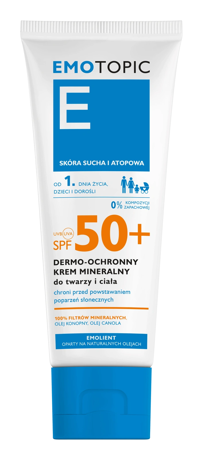 Emotopic Dermo-ochronny krem mineralny SPF 50+ do twarzy i ciała to specjalistyczny emolient przeciwsłoneczny zapewniający bardzo wysoką ochronę UVA/UVB, opracowany z myślą o skórze wrażliwej, atopowej, skłonnej do alergii i nietolerancji filtrów chemicznych. Formuła oparta na 100% filtrów mineralnych skutecznie odbija i rozprasza promienie słoneczne, chroniąc skórę przed poparzeniami, fotostarzeniem oraz reakcjami fotoalergicznymi. Krem może być stosowany od 1. dnia życia, na twarz i ciało, także w okolicach oczu. Nie pozostawia białych śladów, nie klei się i nie brudzi ubrań, zapewniając wysoki komfort codziennego stosowania.