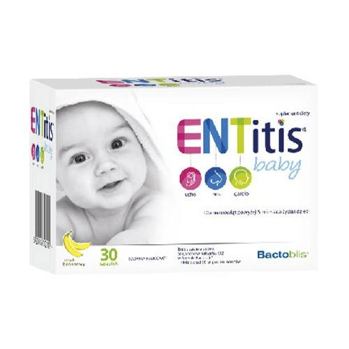 Zawartość saszetki Entitis baby należy przyjmować przed snem po umyciu zębów, tak, aby przez noc szczep mógł skutecznie skolonizować jamę ustną i nosogardziel. Należy podawać dziecku przez około 5 minut tak, aby maksymalnie wydłużyć kontakt preparatu ze śluzówką jamy ustnej dziecka. W tym celu można wykorzystać smoczek dziecka. Otwórz saszetkę i wysyp jej zawartość do czystego kieliszka. Wilgotny smoczek zanurz w proszku. Smoczek z proszkiem umieść w buzi dziecka i poczekaj ok. 30 sekund, aż proszek się rozpuści. Powtarzaj czynność do momentu aż podasz dziecku całą porcję z saszetki. ENTitis baby można również podawać w postaci zawiesiny doustnej za pomocą specjalnego smoczka do podawania preparatów. W przypadku dzieci, które nie korzystają ze smoczka zawartość saszetki można rozpuścić w niewielkiej ilości wody i podawać łyżeczką małymi porcjami przez około 5 minut. Nie należy popijać bezpośrednio po spożyciu. Nie stosować razem z antybiotykiem i preparatami o działaniu przeciwbakteryjnym.