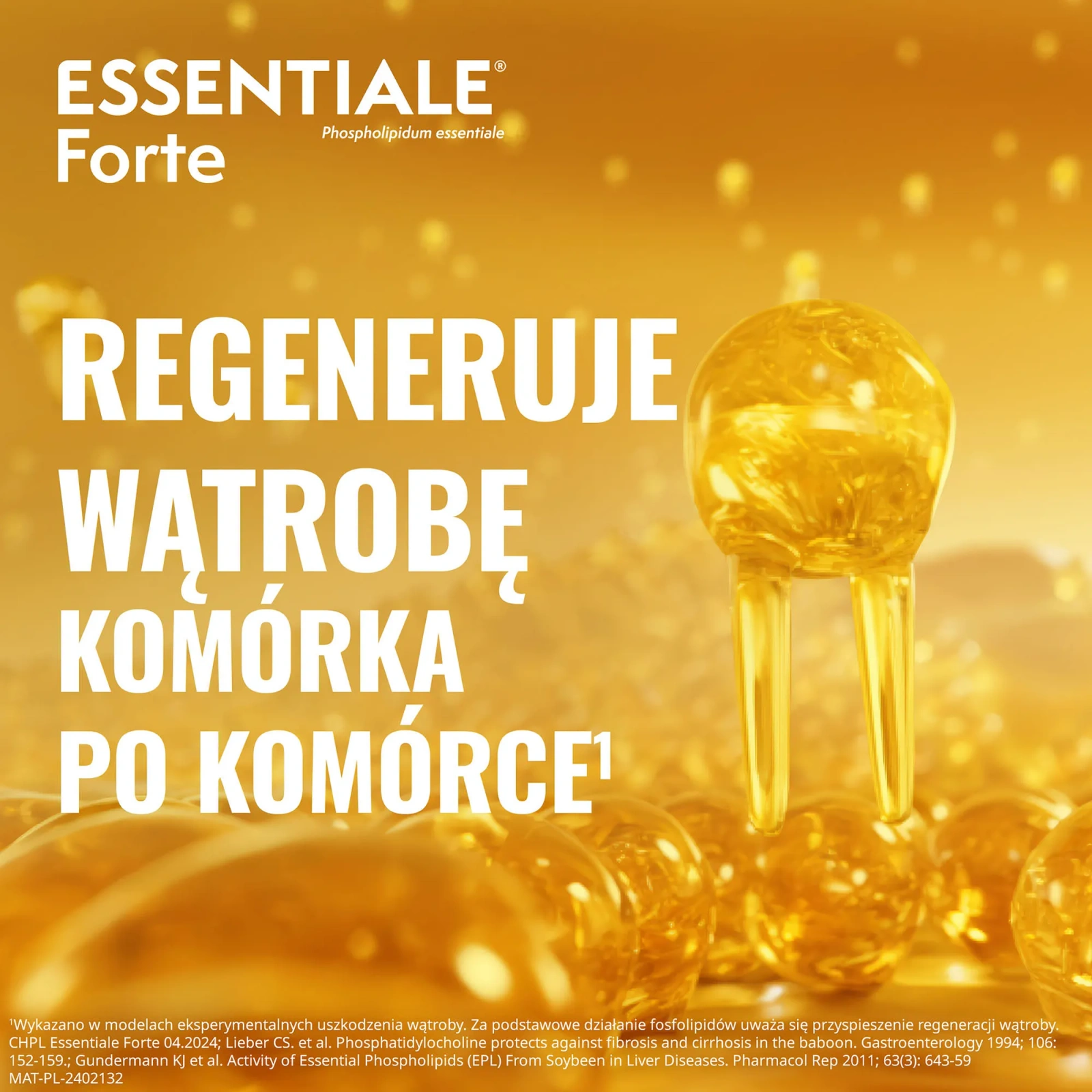 Essentiale Forte to lek OTC zawierający fosfolipidy z nasion soi, które wspomagają odbudowę uszkodzonych komórek wątroby. Stosowany jest w celu łagodzenia subiektywnych dolegliwości takich jak brak apetytu, uczucie ucisku w prawym nadbrzuszu i dyskomfort trawienny, wynikających z uszkodzenia wątroby.