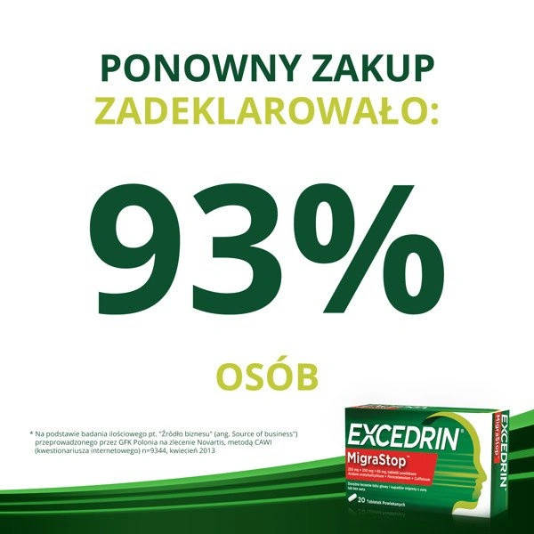 • Każda tabletka leku Excedrin MigraStop zawiera trzy aktywne składniki: kwas acetylosalicylowy, paracetamol i kofeinę, które wspólnie działają przeciwbólowo. Preparat jest zalecany w celu łagodzenia bólu głowy o różnym podłożu.