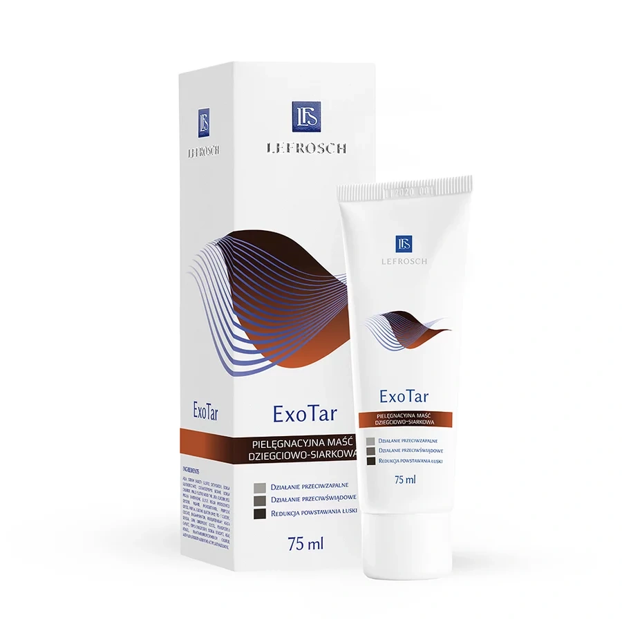 ExoTar Maść to specjalistyczny preparat pielęgnacyjny stworzony z myślą o osobach cierpiących na łuszczycę, egzemę, świąd skóry, liszaj prosty przewlekły oraz grzybicę skóry (wspomagająco). Dzięki połączeniu dziegciu sosnowego, siarki strąconej, kwasu salicylowego oraz masła shea maść działa przeciwzapalnie, ogranicza nadmierne rogowacenie naskórka i łagodzi uciążliwe objawy, takie jak świąd i pieczenie. Masło shea dodatkowo nawilża, wygładza i wspiera proces regeneracji skóry, co sprawia, że ExoTar to skuteczne wsparcie w codziennej pielęgnacji skóry problematycznej.