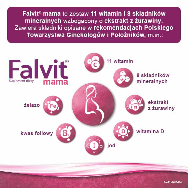 Falvit®mama to starannie dobrany zestaw witamin i składników mineralnych, który uzupełnia zwiększone zapotrzebowanie organizmu kobiety na składniki odżywcze w tym szczególnym okresie. Jest to suplement diety przeznaczony dla kobiet w ciąży i mam karmiących piersią, do stosowania przez cały okres ciąży i laktacji. Dostarcza niezbędną porcję witamin i składników mineralnych m.in. kwas foliowy, jodu, żelaza i witaminy D. Wzbogacony został o standaryzowany ekstrakt z żurawiny.