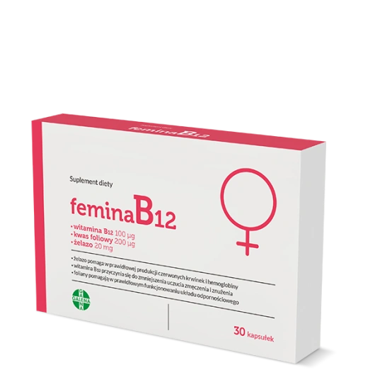 • FeminaB12 – suplement diety dla kobiet z żelazem, witaminą B12 i kwasem foliowym. Wspiera produkcję krwi i zmniejsza uczucie zmęczenia.