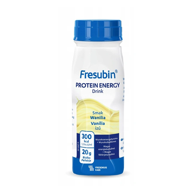- Fresubin Protein Energy Drink, płyn o smaku waniliowym – to żywność specjalnego przeznaczenia medycznego, do postępowania dietetycznego u pacjentów neurologicznych, zwłaszcza pacjentów w podeszłym wieku, niedożywionych lub zagrożonych niedożywieniem.
