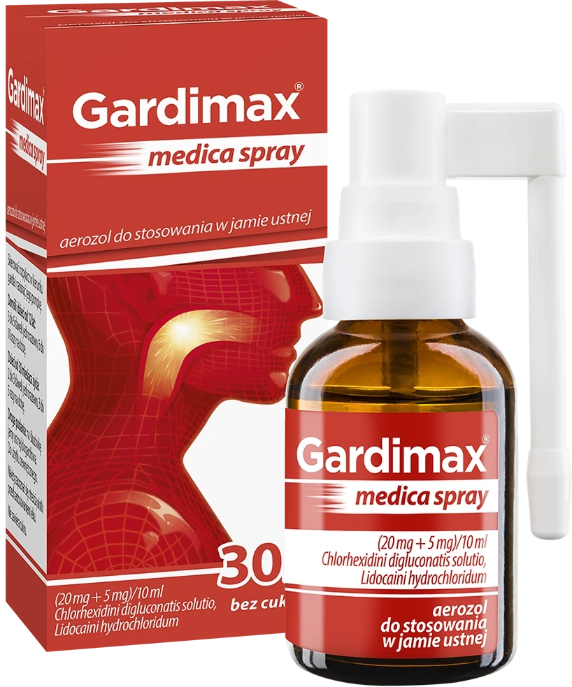 Gardimax medica spray (20 mg + 5 mg)/10 ml to lek w formie aerozolu do jamy ustnej, który łagodzi ból oraz dyskomfort związany ze stanem zapalnym gardła i błony śluzowej jamy ustnej. Zawiera diglukonian chlorheksydyny o działaniu odkażającym oraz chlorowodorek lidokainy, który miejscowo znieczula podrażnione miejsce. Dzięki wygodnej formie sprayu lek można precyzyjnie nanieść na obszar bólu, co daje szybkie odczucie ulgi przy przełykaniu, mówieniu czy jedzeniu. Gardimax medica spray sprawdzi się szczególnie w początkowej fazie infekcji gardła, przy podrażnieniu błony śluzowej spowodowanym m.in. przeziębieniem, nadużywaniem głosu czy oddychaniem przez usta. To praktyczne rozwiązanie dla dorosłych i starszych dzieci, które szukają skutecznego środka do krótkotrwałego, objawowego łagodzenia dolegliwości bólowych w obrębie gardła.