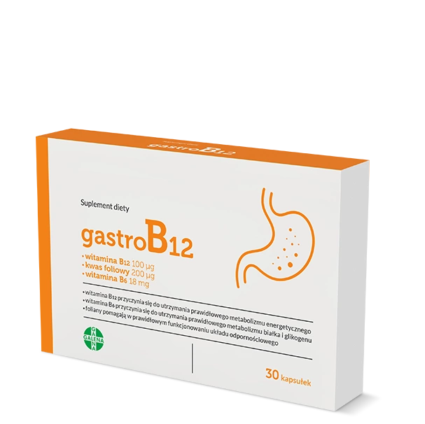 • GastroB12 – suplement diety z witaminami B6, B12 i kwasem foliowym. Wspiera metabolizm energetyczny, odporność i układ nerwowy.