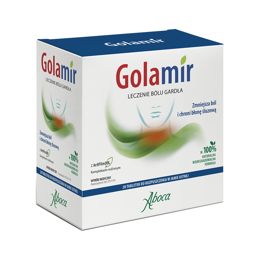 Golamir to wyrób medyczny w postaci tabletek do ssania, wskazany przy bólu gardła, chrypce i podrażnieniach błony śluzowej jamy ustno-gardłowej. Dzięki opatentowanemu kompleksowi roślinnemu ActiFilm DOL tworzy ochronny film na błonie śluzowej, który zmniejsza ból i nadwrażliwość, działa antyoksydacyjnie i wspiera naturalne mechanizmy obronne organizmu. Produkt jest w 100% naturalny, biodegradowalny i może być stosowany także w trakcie przeziębienia.