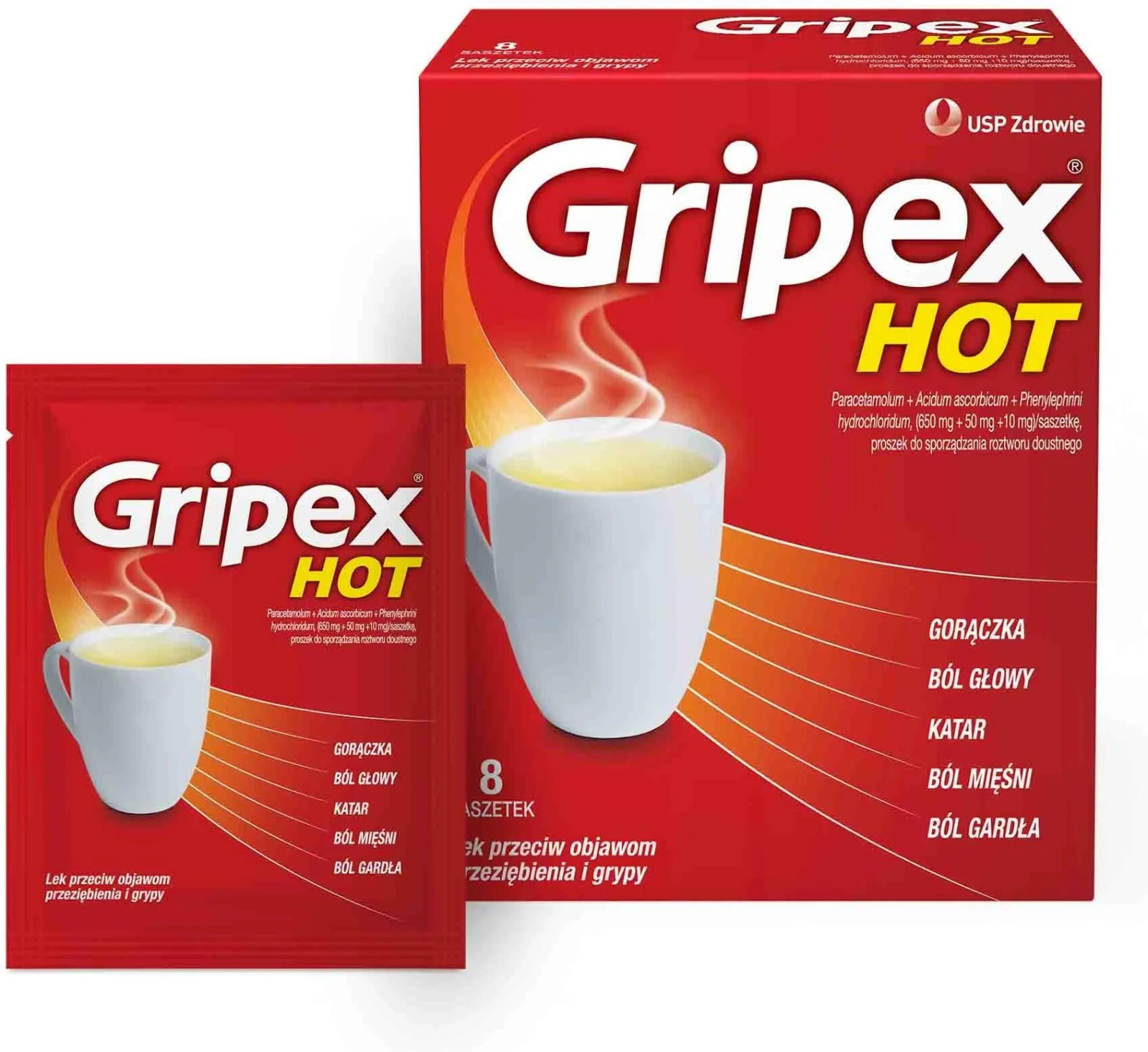 Gripex Hot, proszek do sporządzania roztworu doustnego, to lek wieloskładnikowy o działaniu przeciwgorączkowym, przeciwbólowym i udrożniającym nos. Łagodzi objawy przeziębienia, grypy i chorób grypopodobnych. Wskazaniem do stosowania leku jest łagodzenie objawów przeziębienia, grypy i zakażeń grypopodobnych takich jak: gorączka, bole głowy, gardła, bole mięśniowe i kostnostawowe oraz objawów zapalenia błony śluzowej nosa występujących w przeziębieniu, grypie. Jeśli po upływie 3 do 5 dni nie nastąpiła poprawa lub pacjent czuje się gorzej, należy zwrócić się do lekarza.