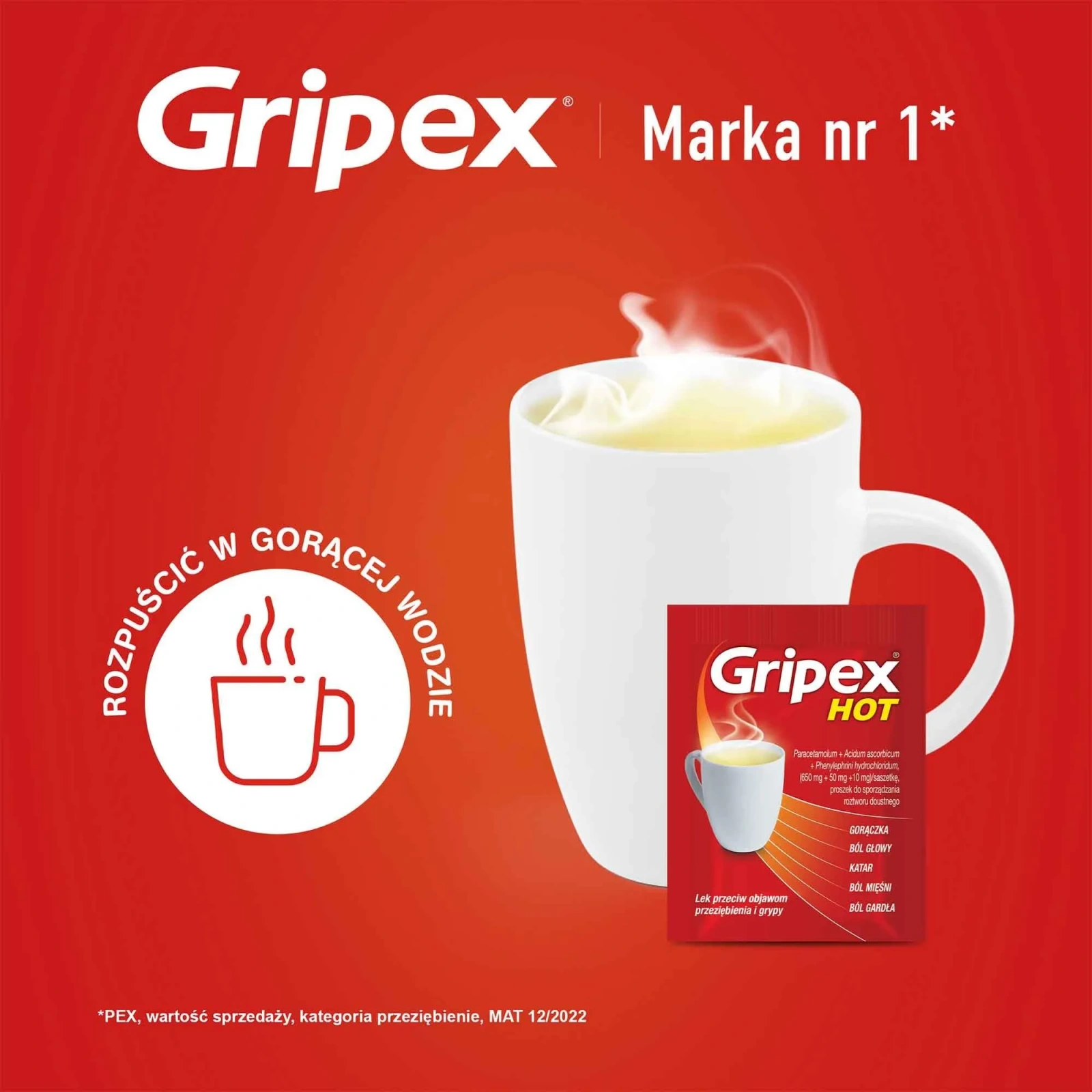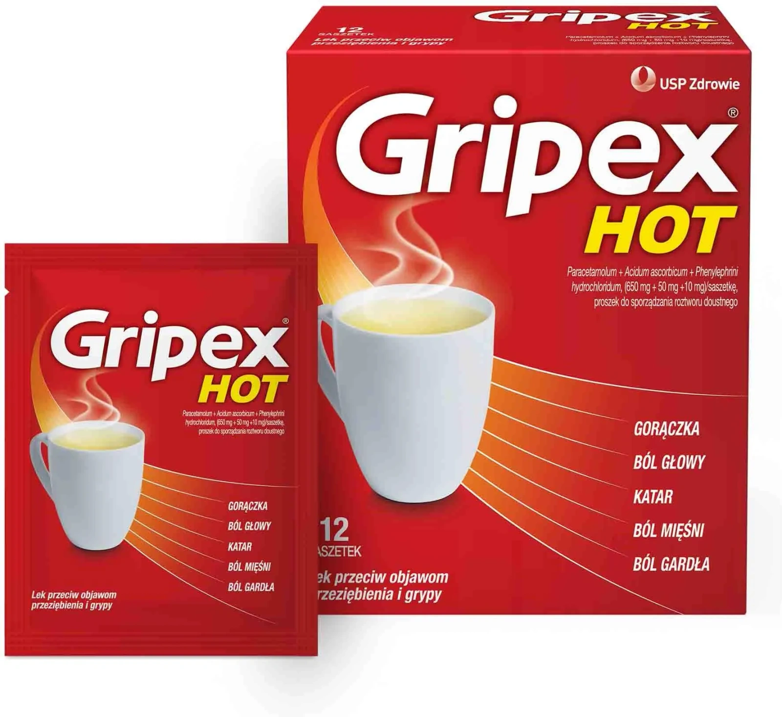Gripex Hot to wieloskładnikowy produkt leczniczy stosowany objawowo w celu łagodzenia objawów przeziębienia, grypy i chorób grypopodobnych. Działa przeciwbólowo, przeciwgorączkowo oraz udrożniająco na nos. Paracetamol obniża gorączkę i łagodzi ból, działając na ośrodkową cyklooksygenazę. Kwas askorbinowy uszczelnia naczynia krwionośne, ogranicza nadmierną produkcję wydzieliny w nosie, poprawia stan tkanek i skraca czas trwania objawów przeziębienia. Fenylefryna zmniejsza przekrwienie i obrzęk śluzówki nosa, ułatwiając oddychanie.