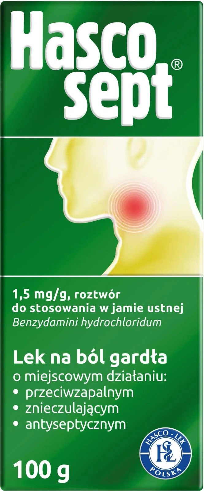 - Hascosept to płyn przeznaczony do stosowania miejscowego w stanach zapalnych jamy ustnej i gardła. Wywiera działanie przeciwzapalne, przeciwbólowe, miejscowo znieczulające i odkażające.