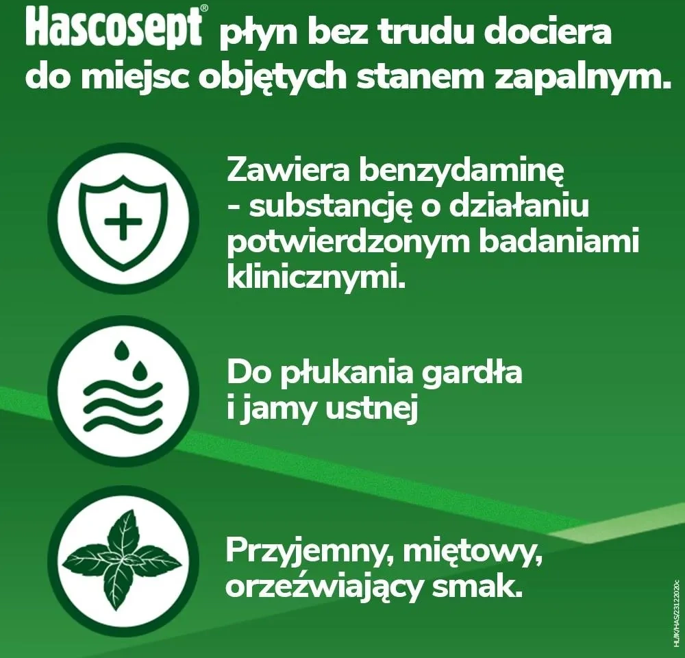• Hascosept to płyn przeznaczony do stosowania miejscowego w stanach zapalnych jamy ustnej i gardła. Wywiera działanie przeciwzapalne, przeciwbólowe, miejscowo znieczulające i odkażające.