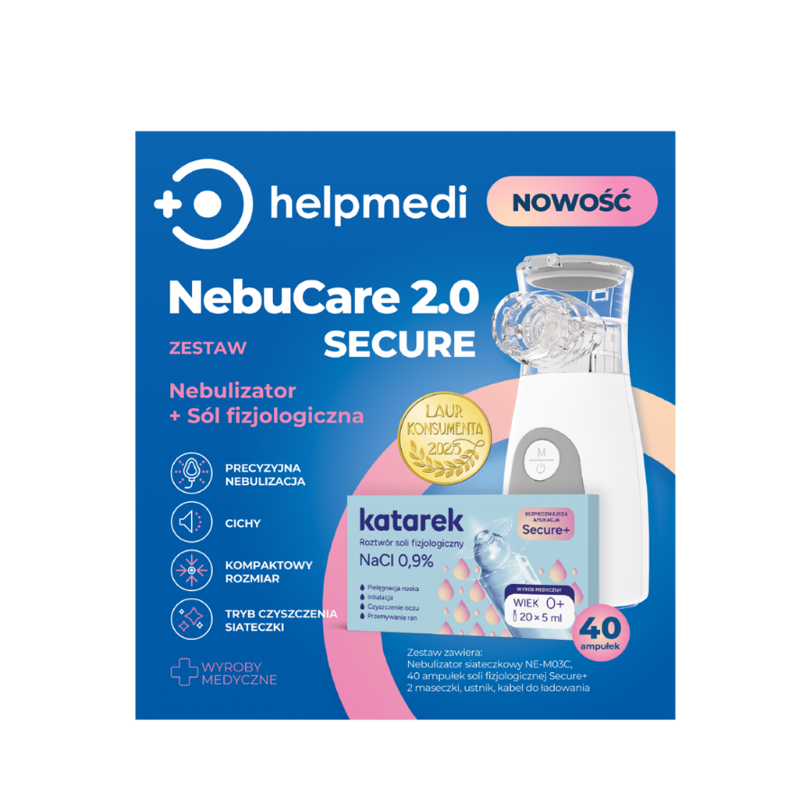 HelpMedi NebuCare 2.0 Secure to nowoczesny, ultracichy nebulizator siateczkowy, zaprojektowany z myślą o dzieciach, niemowlętach i dorosłych, którzy potrzebują skutecznego, a jednocześnie wygodnego wsparcia w leczeniu infekcji i alergii dróg oddechowych. Dzięki pracy poniżej 50 dB urządzenie idealnie sprawdza się również w nocy, nie budząc dziecka i nie stresując malucha głośnymi dźwiękami. Mobilna, bezprzewodowa konstrukcja sprawia, że NebuCare 2.0 Secure można zabrać wszędzie – na wakacje, do dziadków czy w podróż samochodem. W zestawie znajduje się wszystko, czego potrzebuje rodzina do rozpoczęcia nebulizacji: maseczka dla dziecka, maseczka dla dorosłego, ustnik oraz aż 40 ampułek innowacyjnej soli fizjologicznej Katarek Secure+, z bezpiecznym, zaokrąglonym aplikatorem. To kompletny i praktyczny zestaw do cichej nebulizacji w domu i poza nim, który pomaga łagodzić kaszel, katar, objawy przeziębienia, astmy i alergii oddechowych.