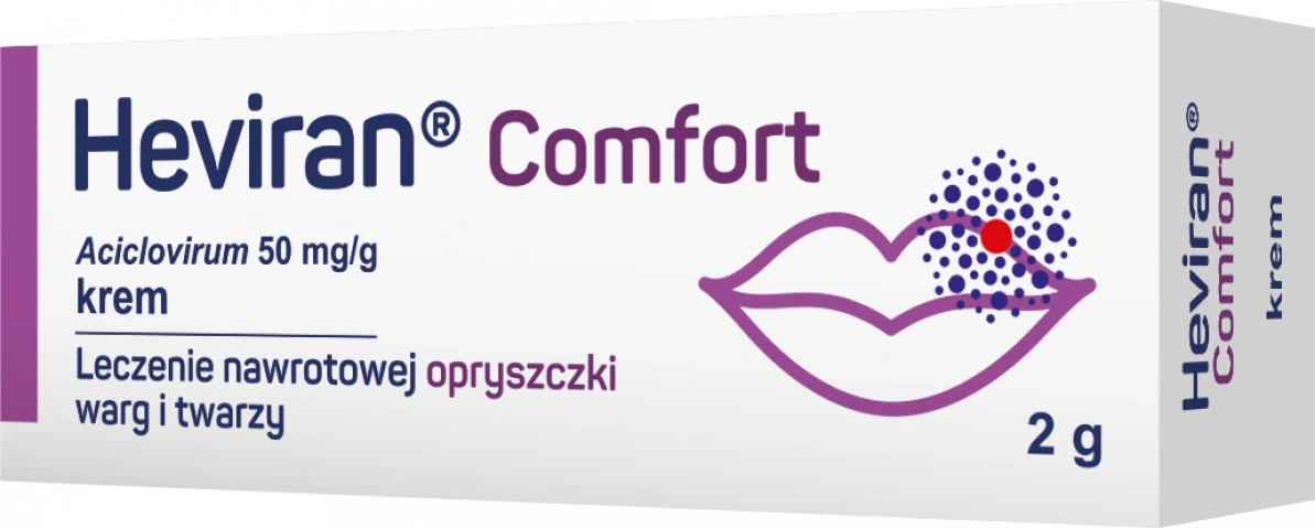 - Lek Heviran Comfort w postaci kremu do stosowania na skórę zawiera substancję czynną acyklowir o działaniu przeciwwirusowym, wykazującą silne działanie na wirusa opryszczki pospolitej (Herpes simplex).