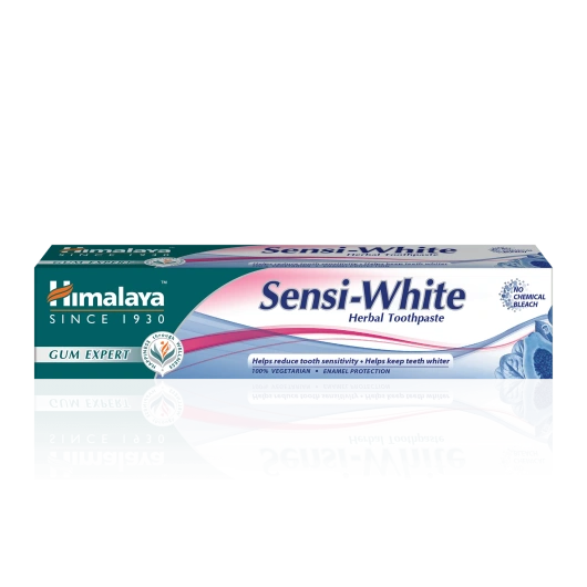 Himalaya Sensi-White Gum Expert Pasta wybielająca do zębów to łagodna, roślinna formuła stworzona z myślą o osobach z nadwrażliwością zębów i potrzebą delikatnego wybielania. Należy do linii Gum Expert, która wykorzystuje Miswak oraz naturalne substancje ściągające, aby wspierać zdrowie dziąseł. Dzięki Technologii Enzymów Roślinnych z papai i ananasa pasta pomaga usuwać powierzchowne przebarwienia i naturalnie utrzymywać biel zębów – bez chemicznych wybielaczy. Dodatkowo ekstrakty ze szpinaku wspierają redukcję nadwrażliwości, a Suryakshara działa kojąco na zęby.