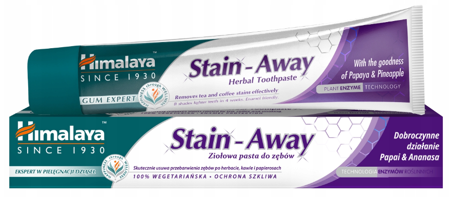 Pasta do zębów Stain-Away to unikalna ziołowa formuła, która wykorzystuje technologię Plant Enzyme Technology, aby delikatnie usuwać plamy z herbaty, kawy i papierosów. To skuteczne połączenie enzymów Papaya i Pineapple pomaga również zapobiegać odkładaniu się płytki nazębnej, dając uśmiech wolny od plam.