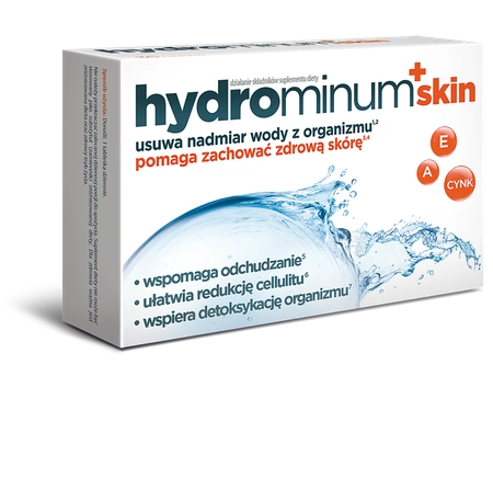 Suplement diety Hydrominum + skin zawiera naturalne składniki wspomagające eliminację wody z organizmu (wyciąg z ziela pokrzywy)oraz proces oczyszczania i fizjologiczną detoksykację (wyciąg z mniszka lekarskiego). Ponadto składniki produktu wspomagają odchudzanie (wyciąg z owocu opuncji figowej) i ułatwiają redukcję cellulitu (wyciąg z nasion winogron). Aby dodatkowo zachować zdrową skórę receptura produktu została wzbogacona o cynk i witaminę A.