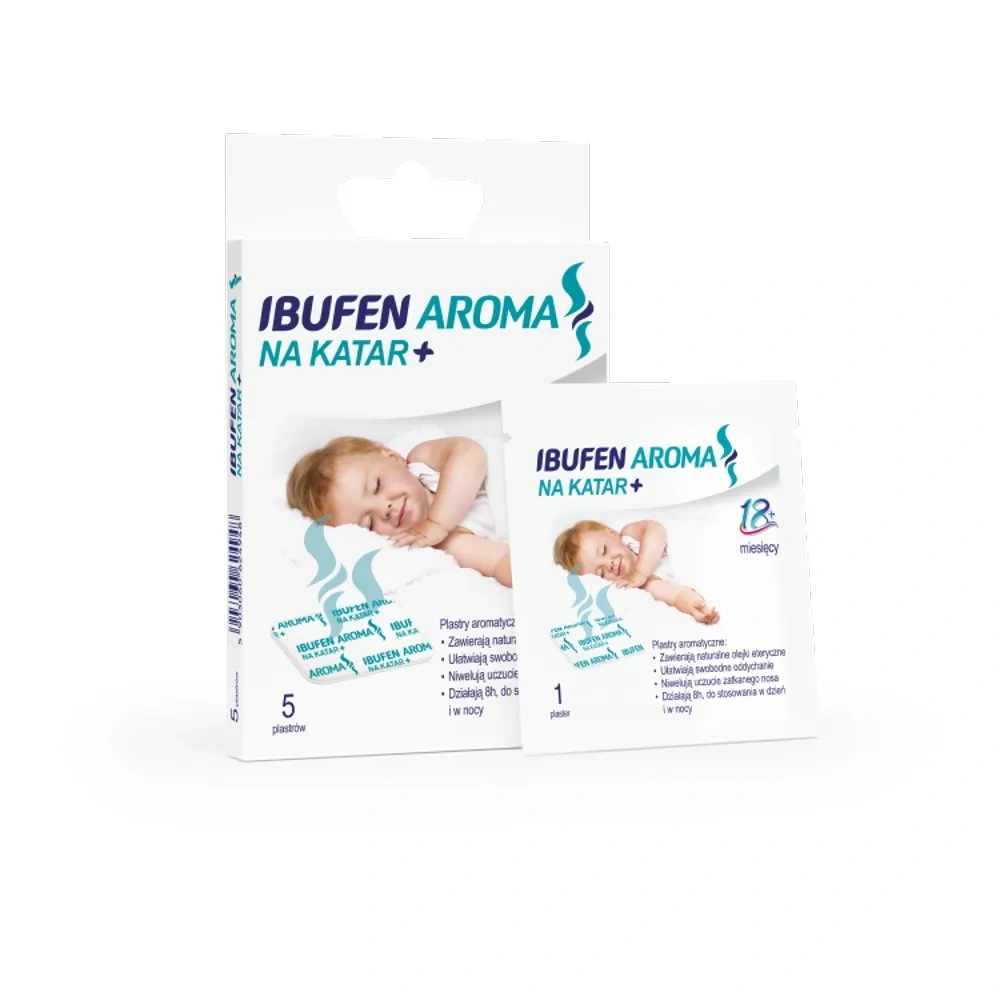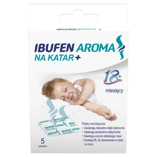 Ibufen Aroma Na Katar+ to samoprzylepne plastry aromatyczne nasączone balsamem na bazie naturalnych olejków eterycznych, stworzone z myślą o łagodzeniu dyskomfortu towarzyszącego katarowi i przeziębieniu. Stopniowo uwalniające się substancje zapachowe wspierają swobodne oddychanie nawet do 8 godzin, pomagając zmniejszyć uczucie zatkanego nosa zarówno w dzień, jak i w nocy. Produkt może być stosowany u dzieci powyżej 18. miesiąca życia oraz u dorosłych, a wygodna forma plastra sprawia, że jego użycie jest szybkie, bezpieczne i komfortowe – bez konieczności aplikacji bezpośrednio na skórę.