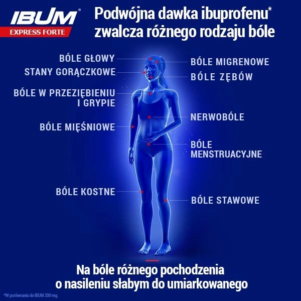 IBUM EXPRESS FORTE to lek na bóle różnego rodzaju o nasileniu słabym do umiarkowanego. Zalecany jest do stosowania dla dorosłych i młodzieży powyżej 12 lat jako lek na: