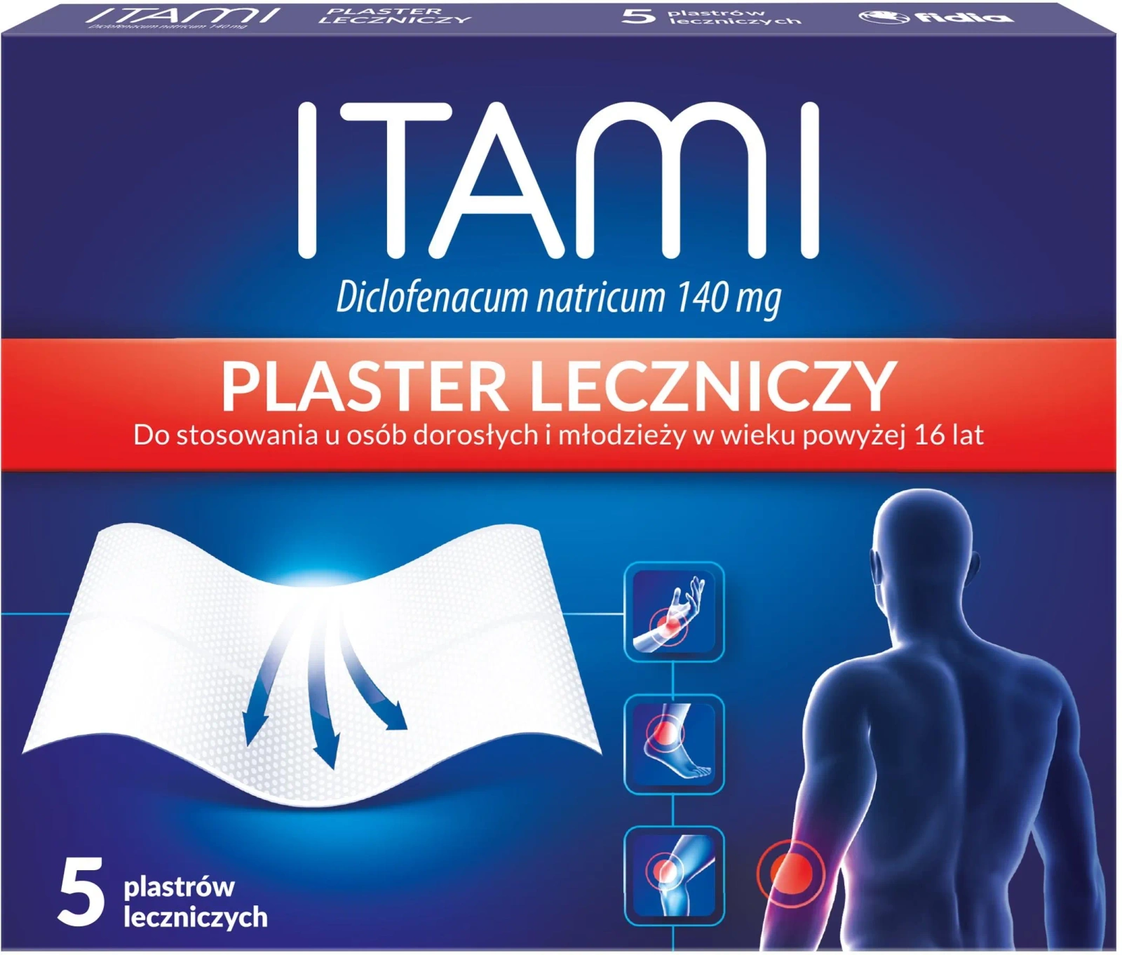 Plastry Itami przeznaczone są do krótkotrwałej kuracji ostrego bólu, wywołanego urazami oraz nadwyrężeniami mięśni kończyn i pleców. Zawierają diklofenak, silny analgetyk z grupy niesteroidowych leków przeciwzapalnych (NLPZ), który hamuje powstawanie mediatorów stanu zapalnego oraz czynników pobudzających impulsację w receptorach bólowych. Działają szybko i długo, umożliwiając sprawne funkcjonowanie mimo dokuczliwych dolegliwości.