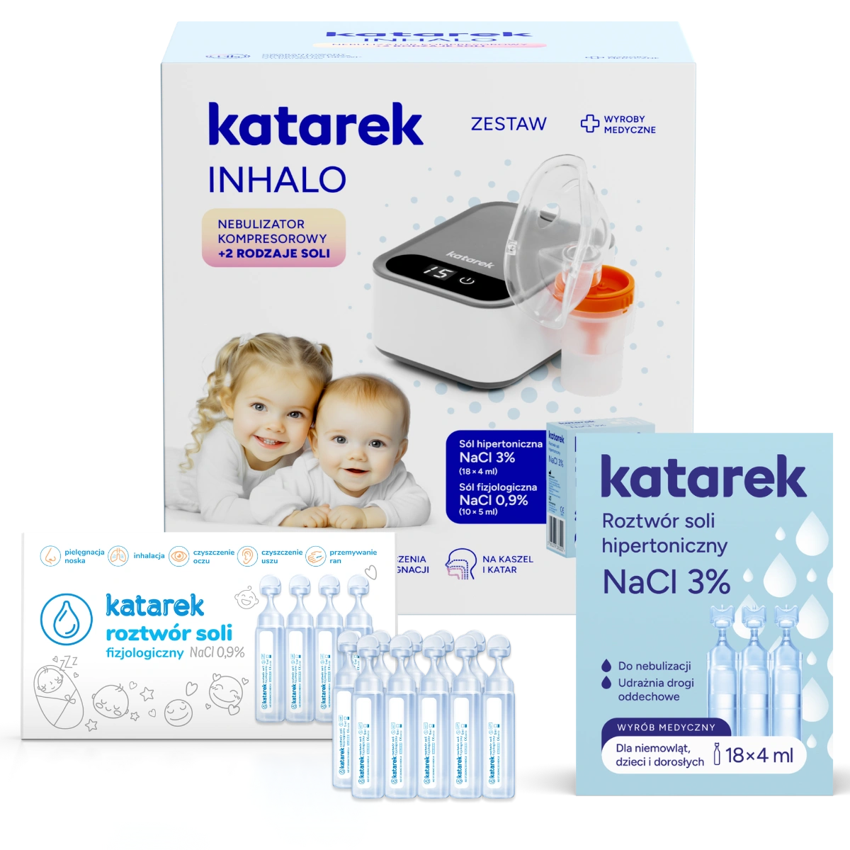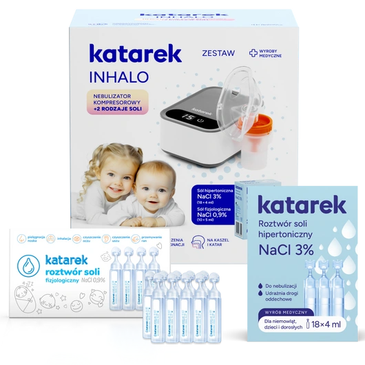 - Katarek Inhalo to zestaw z cichym nebulizatorem i sterylną solą do inhalacji, przeznaczony dla całej rodziny.