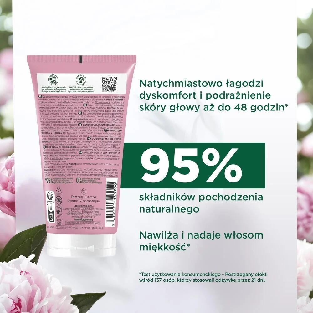- Odżywka z organiczną piwonią to doskonały wybór dla osób z wrażliwą i podrażnioną skórą głowy. Produkt skutecznie koi, nawilża i ułatwia rozczesywanie włosów, zapewniając im zdrowy wygląd i blask.