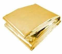 Koc wykonany z folii termoizolacyjnej NRC, w kolorze srebrno-złotym