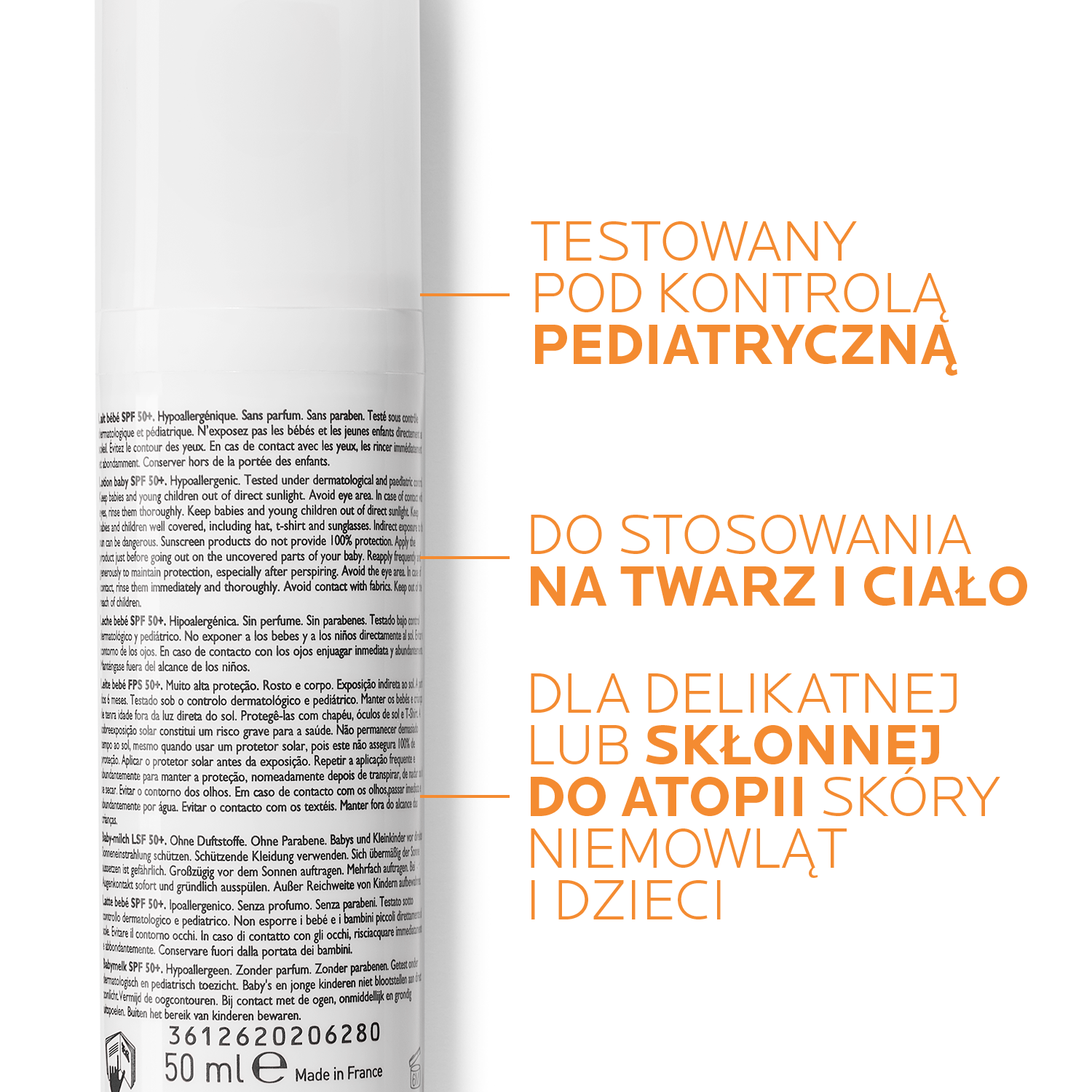 • Anthelios Dermo-Pediatrics SPF 50+ Mleczko do ochrony twarzy i ciała dla niemowląt i dzieci to niezawodna ochrona przed promieniowaniem UVA i UVB już od 6. miesiąca życia.