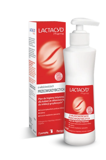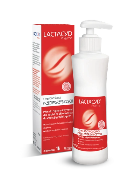 Płyn do higieny intymnej Lactacyd Pharma o właściwościach przeciwgrzybiczych zawiera składniki łagodzące uciążliwe objawy infekcji wywołanych przez drożdżaki z gatunku Candida albicans, zwłaszcza pieczenie, swędzenie i podrażnienie wywołane przez grzybicę. Stosowanie produktu wpływa kojąco na miejsca intymne. Przywraca naturalną równowagę okolic i zapewnia uczucie świeżości.