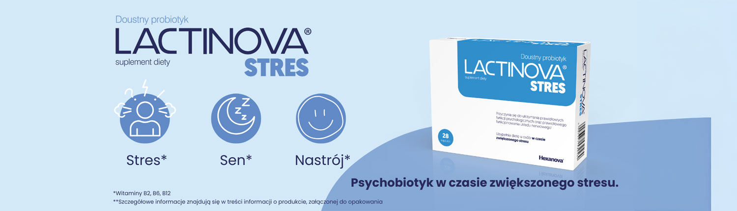 Lactinova® Stres to suplement diety w formie probiotyku doustnego, opracowany z myślą o osobach narażonych na długotrwały stres. Preparat zawiera dwa przebadane klinicznie szczepy bakterii probiotycznych Limosilactobacillus reuteri PBS072 i Bifidobacterium breve BB077 oraz witaminy z grupy B, które wspierają prawidłowe funkcjonowanie układu nerwowego i pomagają utrzymać prawidłowe funkcje psychologiczne. Dodatek prebiotyku Fibregum sprzyja wzrostowi korzystnej mikroflory jelitowej. Dzięki opatentowanej technologii MICROBAC, bakterie probiotyczne są chronione i dostarczane do jelit w optymalnej ilości.