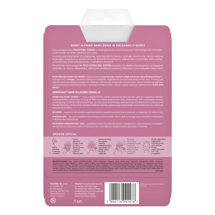 - Hydrożelowa maska do twarzy z linii PGA Hydro Fusion z aktywną hydroformułą zawierającą kwas poliglutaminowy SynerPGAHydroPower+® oraz kolagen natychmiastowo wygładza skórę, poprawia jej elastyczność i zmniejsza widoczność zmarszczek.