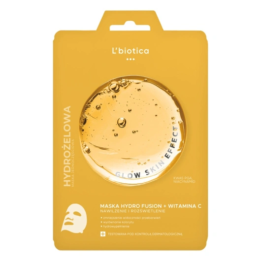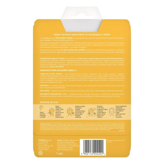 Hydrożelowa maska do twarzy z linii PGA Hydro Fusion z aktywną hydroformułą zawierającą kwas poliglutaminowy SynerPGAHydroPower+® oraz witaminę C natychmiastowo odświeża i dodaje skórze blasku oraz wyrównuje jej koloryt, zmniejszając widoczność przebarwień. Już po pierwszym użyciu skóra zyskuje GLOW SKIN EFFECT - zdrowy wygląd, pełen blasku.