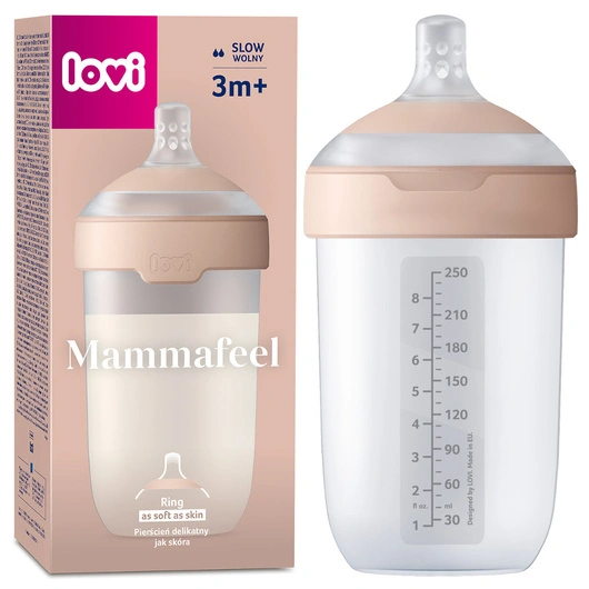 LOVI Mammafeel 250 ml to innowacyjna butelka stworzona do podawania odciągniętego mleka w sposób maksymalnie zbliżony do karmienia piersią. Dzięki unikalnemu projektowi, jej kształt, tekstura oraz dynamika odwzorowują naturalne ssanie, co pozwala dziecku czuć bliskość mamy nawet podczas karmienia butelką. Butelka umożliwia swobodny powrót do karmienia piersią, minimalizując ryzyko zaburzenia odruchu ssania.