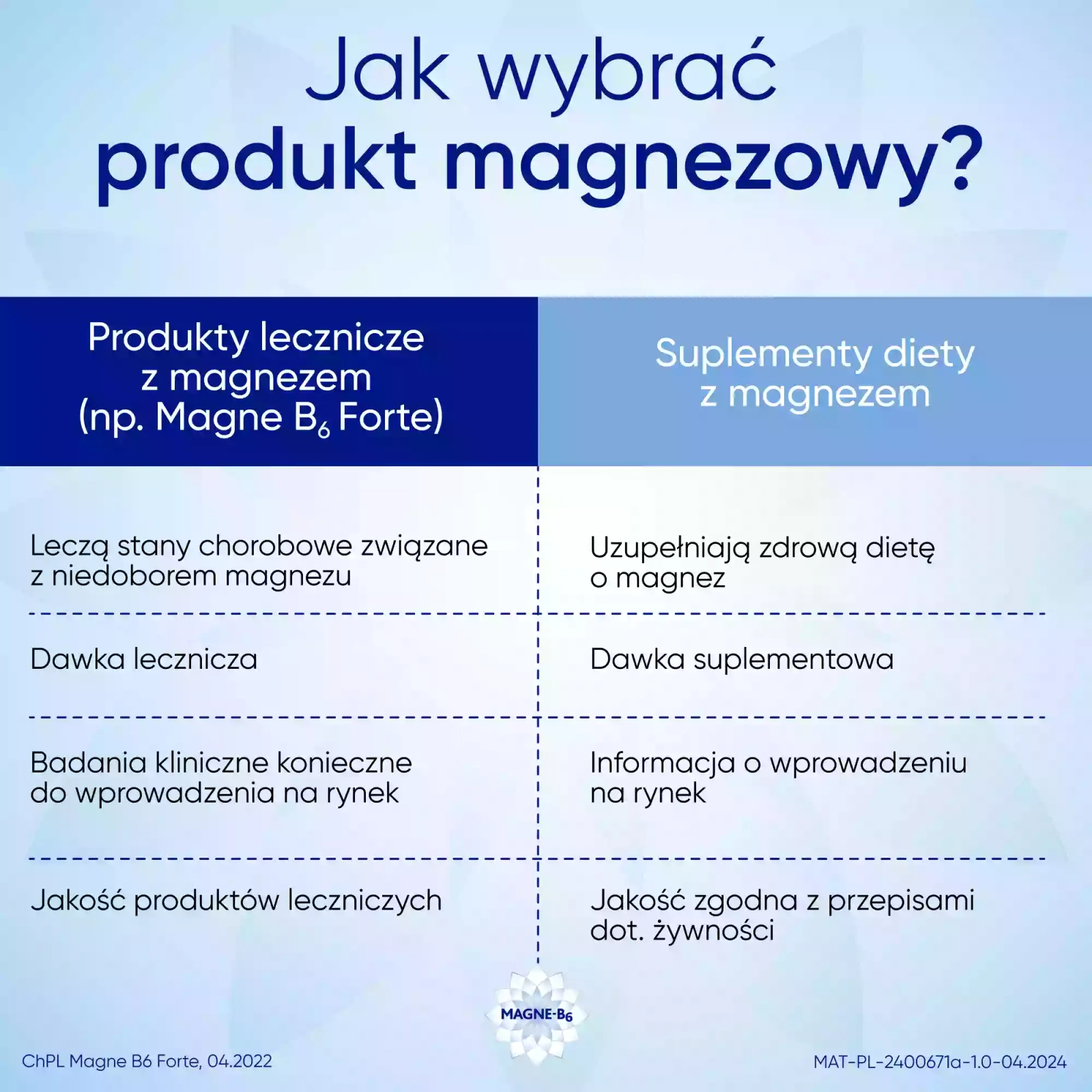 • Magne-B6 Forte to suplement diety, który wspomaga utrzymanie prawidłowego poziomu magnezu w organizmie. Pomaga w redukcji objawów związanych z niedoborem magnezu, takich jak zmęczenie, osłabienie, drażliwość oraz skurcze mięśni.
