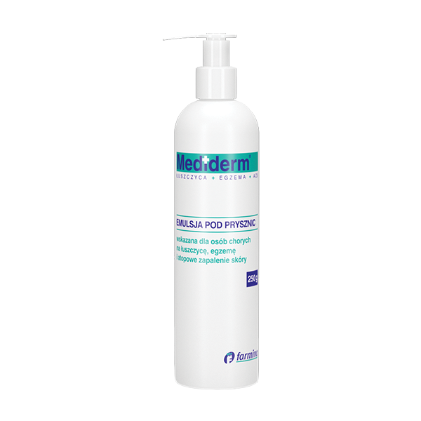 • Mediderm Shower jest wyrobem medycznym w postaci nawilżającej emulsji do mycia całego ciała, opracowaną w celu pielęgnacji chorobowo zmienionej skóry w przebiegu łuszczycy, egzemy i atopowego zapalenia skóry.