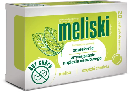 Suplement diety Meliski to połączenie wyciągów roślinnych pochodzenia naturalnego: wyciągu z ziela melisy i wyciągu z szyszek chmielu. Wyciąg z ziela melisy wspiera utrzymanie pozytywnego nastroju i uczucia odprężenia oraz pomaga zmniejszyć napięcie. Dodatkowo, wyciąg z szyszek chmielu wspomaga utrzymanie zdrowego snu.
