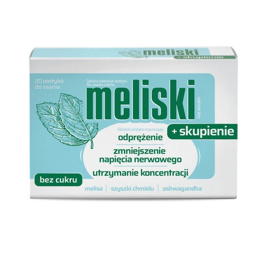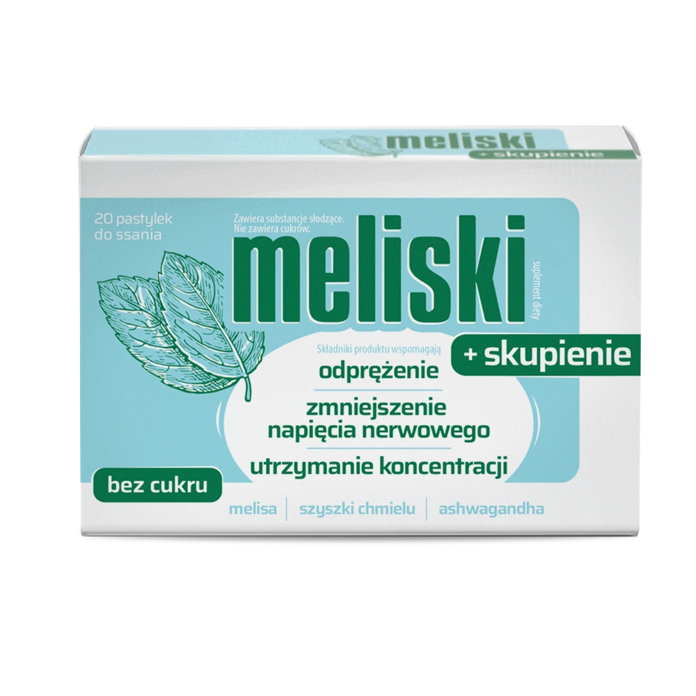 Meliski + Skupienie to suplement diety w formie pastylek do ssania, które wspierają odprężenie i koncentrację w sytuacjach stresowych. Formuła oparta na naturalnych ekstraktach roślinnych – melisie, chmielu i ashwagandzie – pomaga zmniejszyć napięcie nerwowe, poprawia samopoczucie i wspiera zdolności poznawcze. Pastylki mają cytrynowo-ziołowy smak, są bez dodatku cukru i mogą być stosowane w ciągu dnia jako wsparcie w momentach spadku koncentracji.