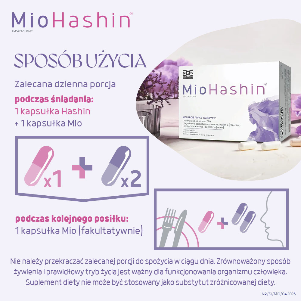 - podczas śniadania – 1 kapsułka Mio + 1 kapsułka Hashin