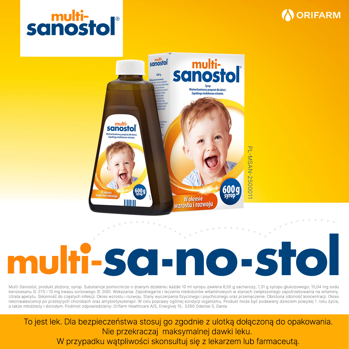 Multi-Sanostol to złożony produkt leczniczy, który uzupełnia zapotrzebowanie rosnącego i rozwijającego się organizmu na niezbędne witaminy oraz wapń. Dostarcza składniki, które regulują podstawowe przemiany ana- i kataboliczne, kontrolują gospodarkę energetyczną oraz tonizują aktywność ośrodkowego układu nerwowego, jednocześnie wspomagając funkcje poznawcze, takie jak koncentracja, pamięć i zdolność uczenia się. Wspierają prawidłowe funkcjonowanie praktycznie wszystkich narządów i tkanek, dlatego powinny stanowić nieodłączną część codziennej diety.