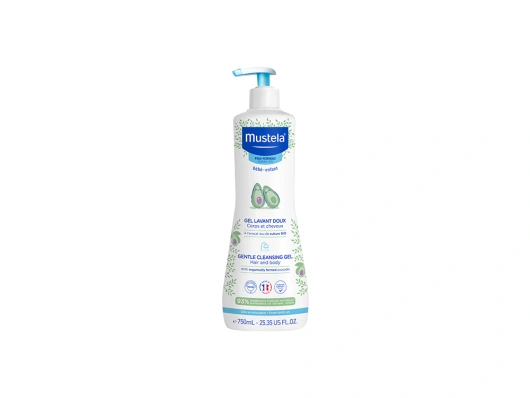 - Łagodny, naturalny żel do mycia Mustela dla niemowląt od 1. dnia życia — delikatnie oczyszcza, chroni i koi skórę ciała oraz głowy.