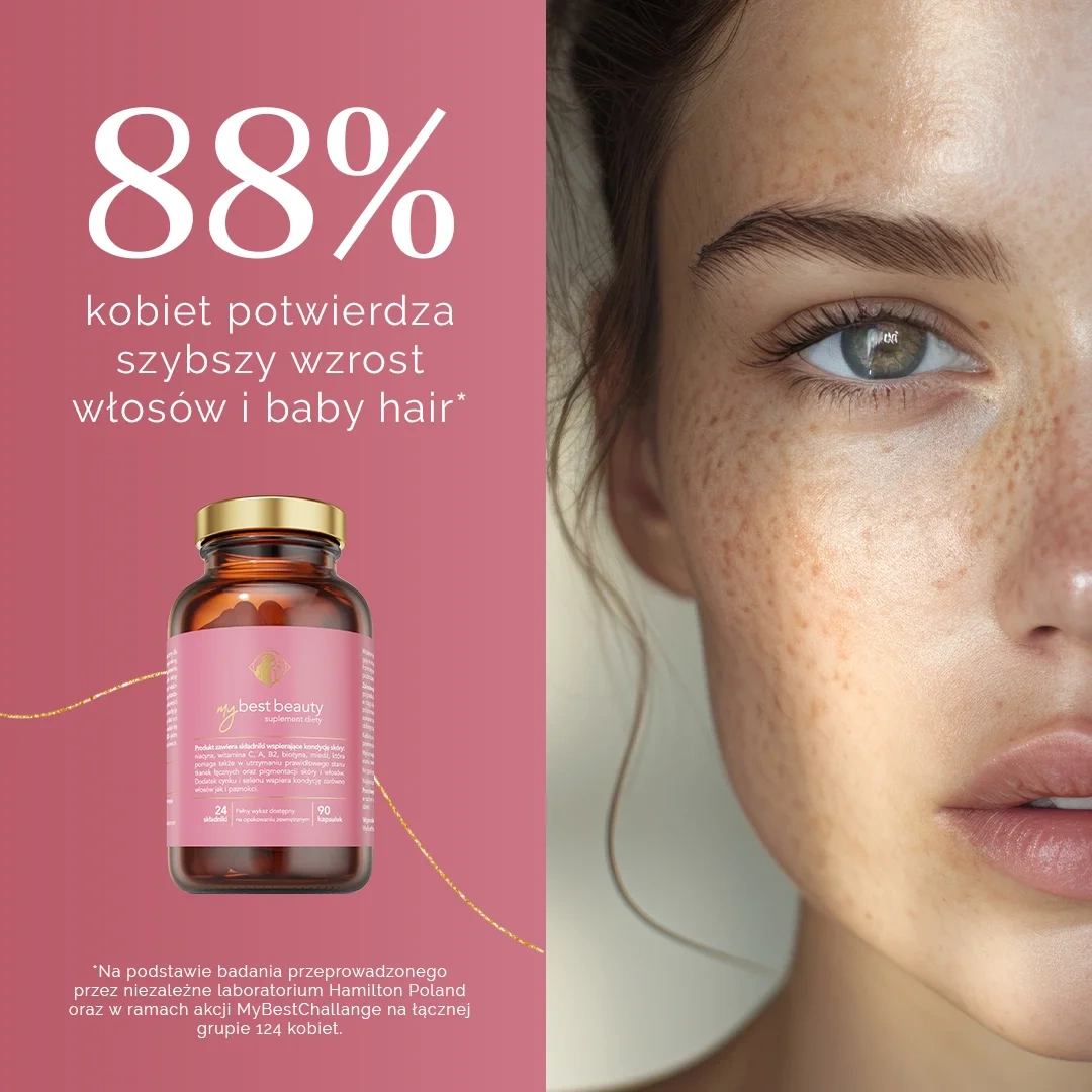 MyBestBeauty to suplement diety, który wspiera zdrowie włosów, skóry i paznokci. Polecany przez Polskie Stowarzyszenie Trychologiczne, jest idealnym rozwiązaniem dla osób pragnących poprawić kondycję tych trzech kluczowych elementów urody. Produkt cieszy się dużym uznaniem wśród kobiet, a 96% z nich potwierdziło wzmocnienie włosów, 95% zauważyło poprawę płytki paznokci, a 88% doświadczyło szybszego wzrostu włosów oraz pojawienia się baby hair. Wyniki badania przeprowadzonego na grupie 124 kobiet wykazały znaczną skuteczność suplementu, zarówno w kontekście poprawy kondycji włosów, jak i paznokci.