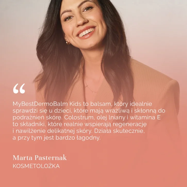 MyBestDermo Balm KIDS to lekki, szybko wchłaniający się balsam do pielęgnacji skóry dzieci, który nie pozostawia tłustej warstwy, a jednocześnie skutecznie nawilża, regeneruje i chroni. Idealny do codziennego stosowania, zwłaszcza po kąpieli.