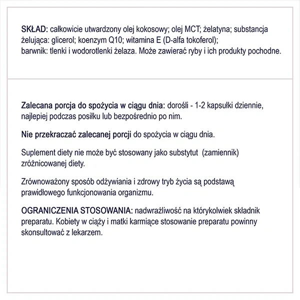 Składniki: całkowicie utwardzony olej kokosowy; olej MCT; żelatyna; substancja żelująca: glicerol; koenzym Q10; witamina E (D-alfa tokoferol); barwnik: tlenki i wodorotlenki żelaza.