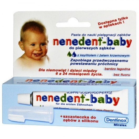 Działanie: Pasta do nauki pielęgnacji zębów nenedent-baby do delikatnego mycia pierwszych ząbków + szczoteczka do zębów z silikonu. Pasta do nauki pielęgnacji ząbków nenedent-baby opracowano specjalnie z myślą o pierwszych ząbkach uwzględniając to, że niemowlęta nie potrafią jeszcze prawidłowo wypłukać pasty.