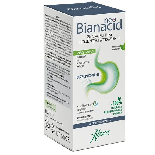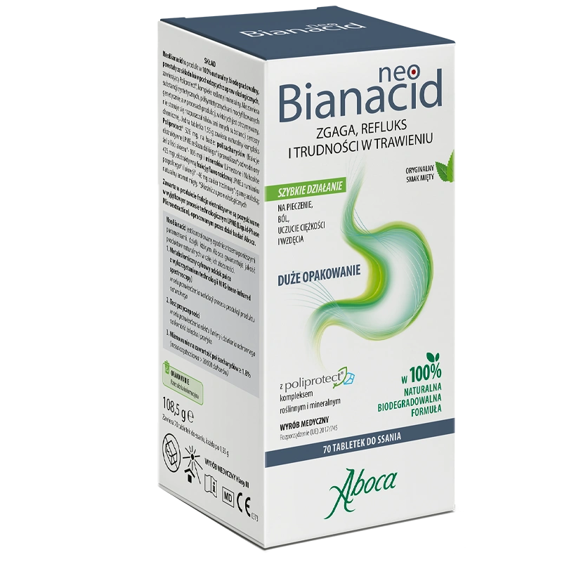 NeoBianacid smak mięty to wyrób medyczny oparty na opatentowanym kompleksie Poliprotect®, który tworzy na błonie śluzowej warstwę ochronną wspierającą naturalną barierę organizmu przed działaniem soków żołądkowych i substancji drażniących. Dzięki połączeniu składników roślinnych (m.in. ślazu, prawoślazu, aloesu, rumianku i lukrecji) oraz mineralnych, NeoBianacid działa szybko i w naturalny sposób, przynosząc odczuwalną ulgę przy zgadze, refluksie i trudności w trawieniu.