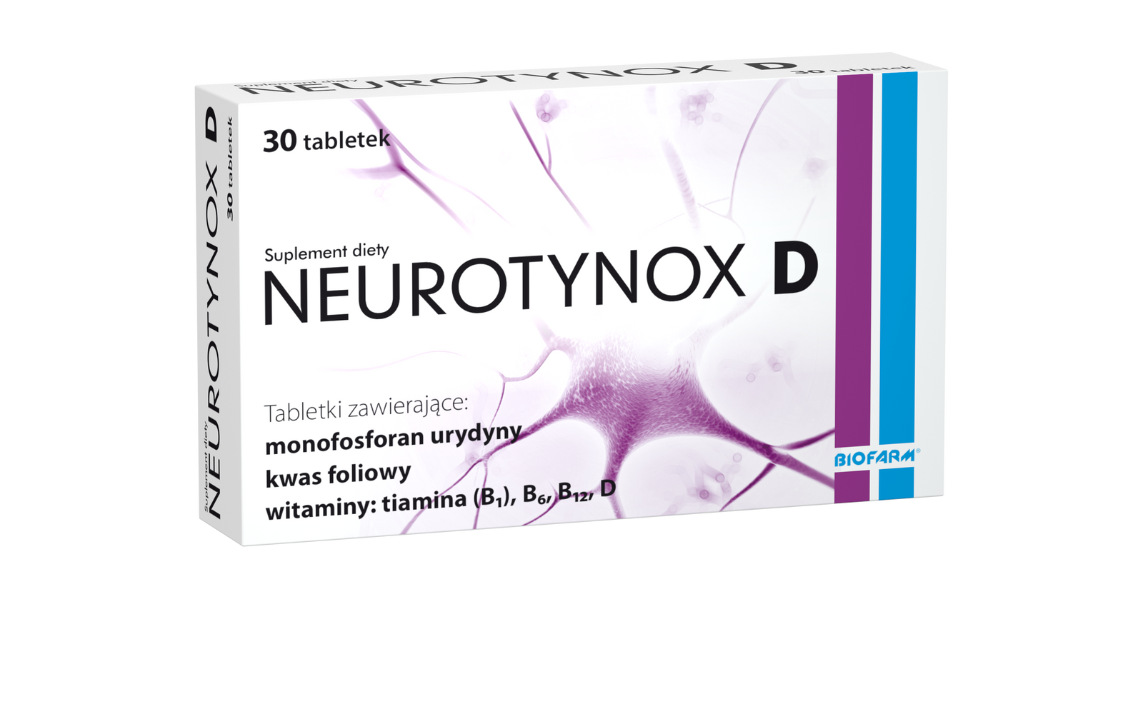 Neurodynox D to suplement diety w tabletkach, opracowany dla osób dorosłych, które chcą zadbać o prawidłowe funkcjonowanie układu nerwowego, odporności oraz zmniejszenie uczucia zmęczenia i znużenia. Zawiera monofosforan urydyny oraz starannie dobrany zestaw witamin: B1, B6, B12, kwas foliowy i witaminę D. Dzięki temu wspiera organizm w procesach energetycznych, podziale komórek, a także pomaga zachować zdrowe kości i prawidłowe funkcje psychologiczne.