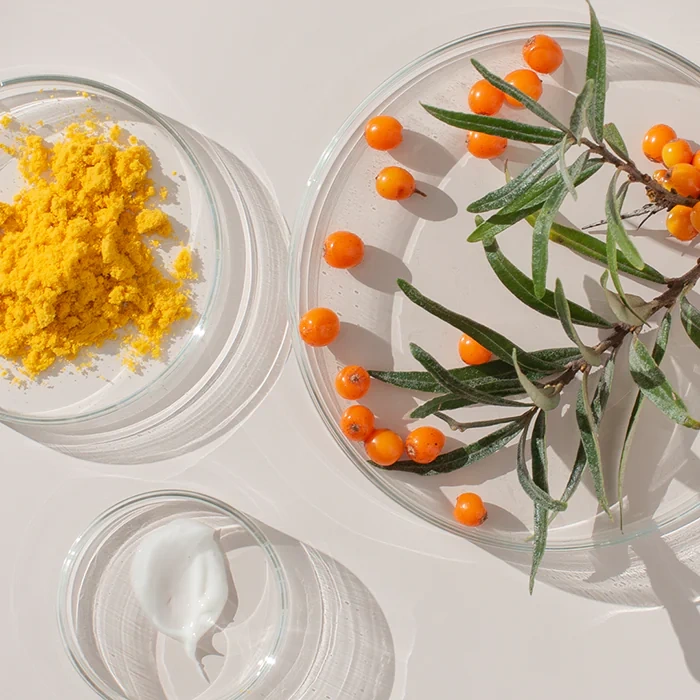 Ekstrakt z rokitnika (Hippophae Rhamnoides) – poprawia elastyczność i regenerację skóry, wspiera odnowę komórkową.