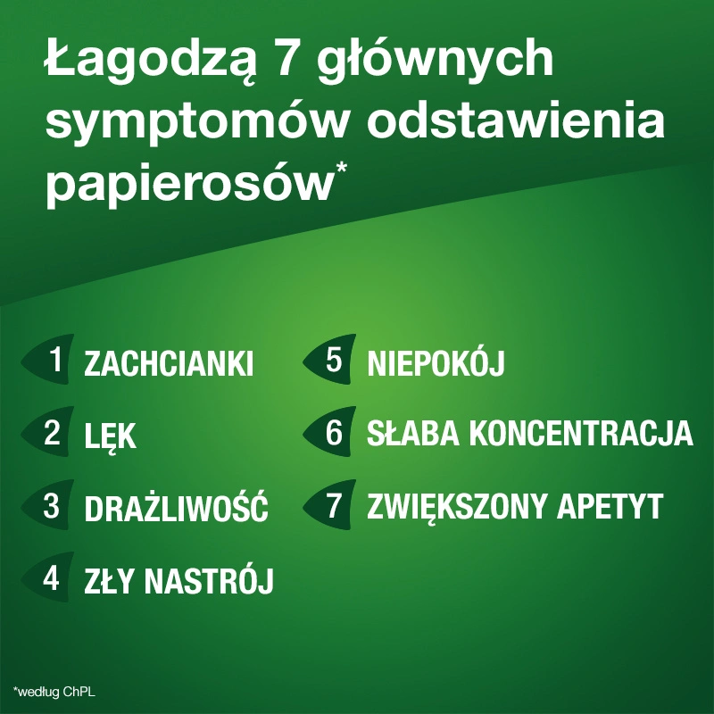 - Leczenie uzależnienia od wyrobów tytoniowych u osób zdecydowanych na rzucenie nałogu poprzez zmniejszenie głodu nikotynowego i objawów odstawiennych, występujących po zaprzestaniu palenia.