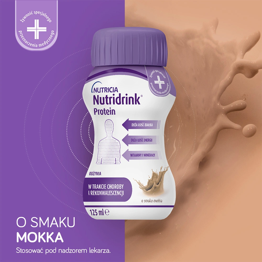 - Nutridrink Protein jest produktem wysokobiałkowym, wysokoenergetycznym. Żywność specjalnego przeznaczenia medycznego. Do postępowania dietetycznego w niedożywieniu i ryzyku niedożywienia związanym z chorobą, szczególnie u pacjentów ze zwiększonym zapotrze