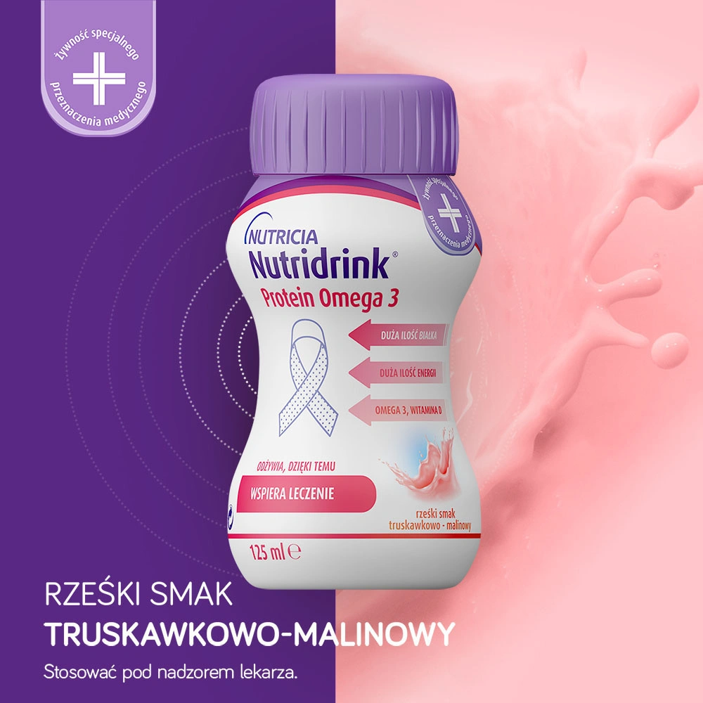 Nutridrink Protein Omega 3 to żywność specjalnego przeznaczenia medycznego, przeznaczona do postępowania dietetycznego u pacjentów z chorobą nowotworową z niedożywieniem lub ryzykiem niedożywienia związanym z tą chorobą. Produkt jest wysokoenergetyczny, wysokobiałkowy, zawiera kwasy tłuszczowe Omega-3 oraz witaminę D, co wspiera uzupełnianie niedoborów żywieniowych. Stosować pod nadzorem lekarza.