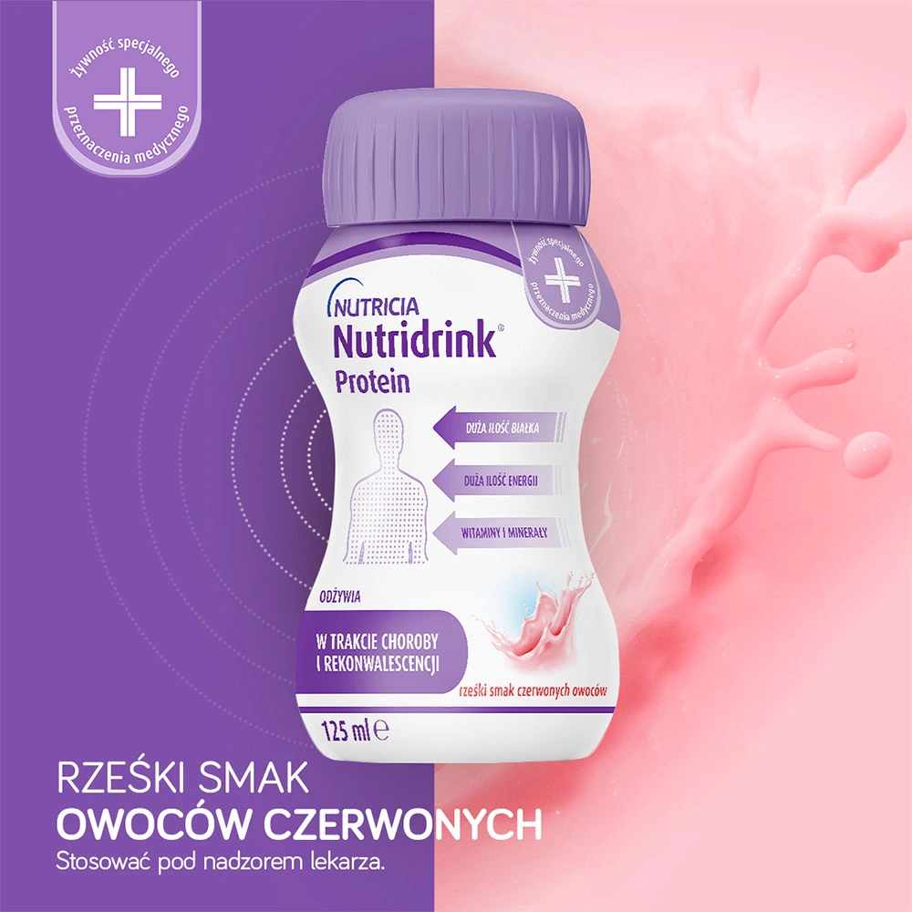 Nutridrink Protein to żywność specjalnego przeznaczenia medycznego. Do postępowania dietetycznego w niedożywieniu i ryzyku niedożywienia związanym z chorobą, szczególnie u pacjentów ze zwiększonym zapotrzebowaniem białkowym. Stosować pod nadzorem lekarza.